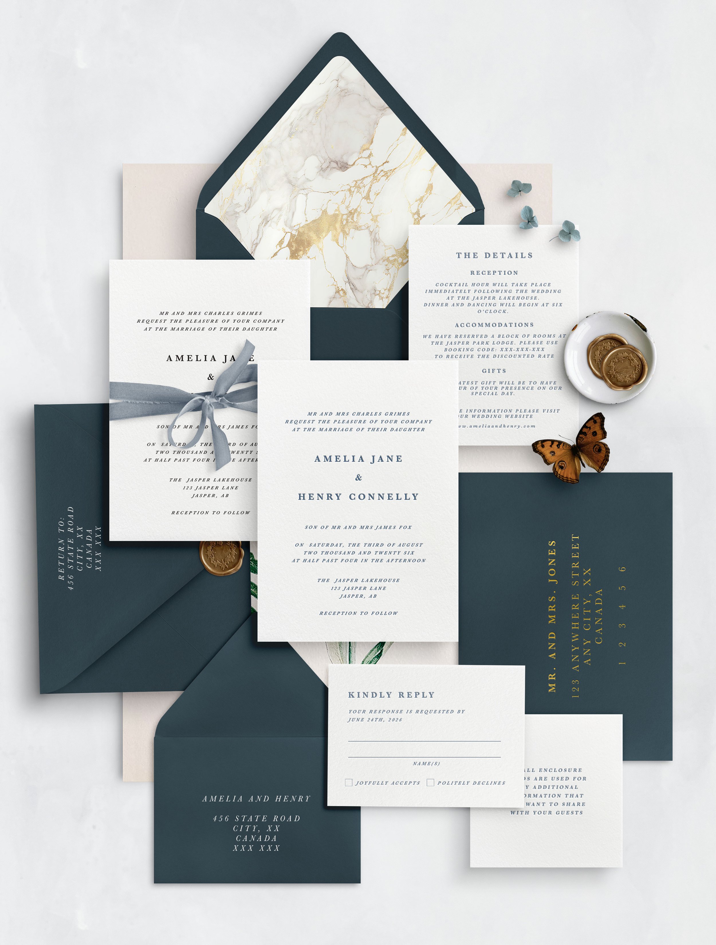 Invitation, RSVP card, details card, and coordinating enclosure card and envelope